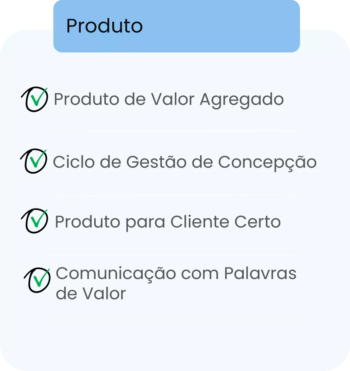 Além do Produto & Modelo de Negócio: o módulo que te ensina sobre a lógica de negócios, a comunicação de todas as áreas, a intermediação entre produto e proposta ofertada para o cliente. Aqui vamos alinhar a comunicação tanto dos canais (físicos e digitais), alinhar tecnologias e os principais recursos enxutos, definir quais serão as atividades que iremos priorizar para dar o primeiro salto. E além disso, a formatar o primeiro diagrama de preços projetável para estruturarmos logo em seguida a estrutura do negócio em si.
