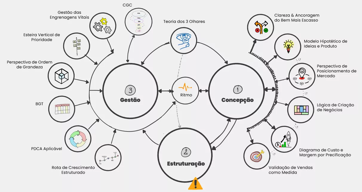 Além da Estruturação das Engrenagens Vitais: nesse módulo você vai trabalhar com as 3 dimensões da oganização financeira e burocracias, o módulo que te ensina sobre vendas, ciclo de gestão por camadas mais detalhadas, de atendimento a entrega, a construção de LTV para uma longa jornada, pois o que a gente quer é um negócio de longo prazo, certo?