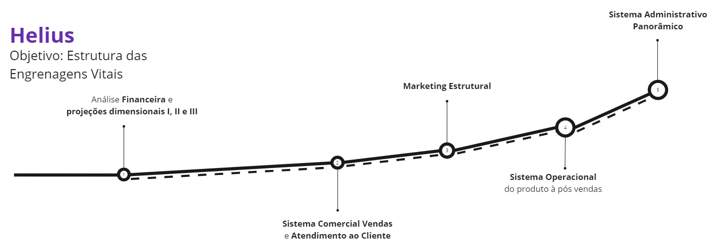 De origem mitológica grega, Helius significa o Sol, e no método APE, se trata de dar vida ao que a luz tocar. E partindo dela estruturar todas as engrenagens que dão vida e perenidade ao negócio. Aqui a parte da administração, comercial, marketing, finanças abre as portas para a estruturação de previsibilidade. Em suas 3 fases, estabelece a profundidade necessária que você precisa ter para que o negócio esteja pronto para receber equipes e assim estruturar com mais detalhe os ciclos mais profissionais do negócio, no campo da gestão e planejamento em nível estratégico.