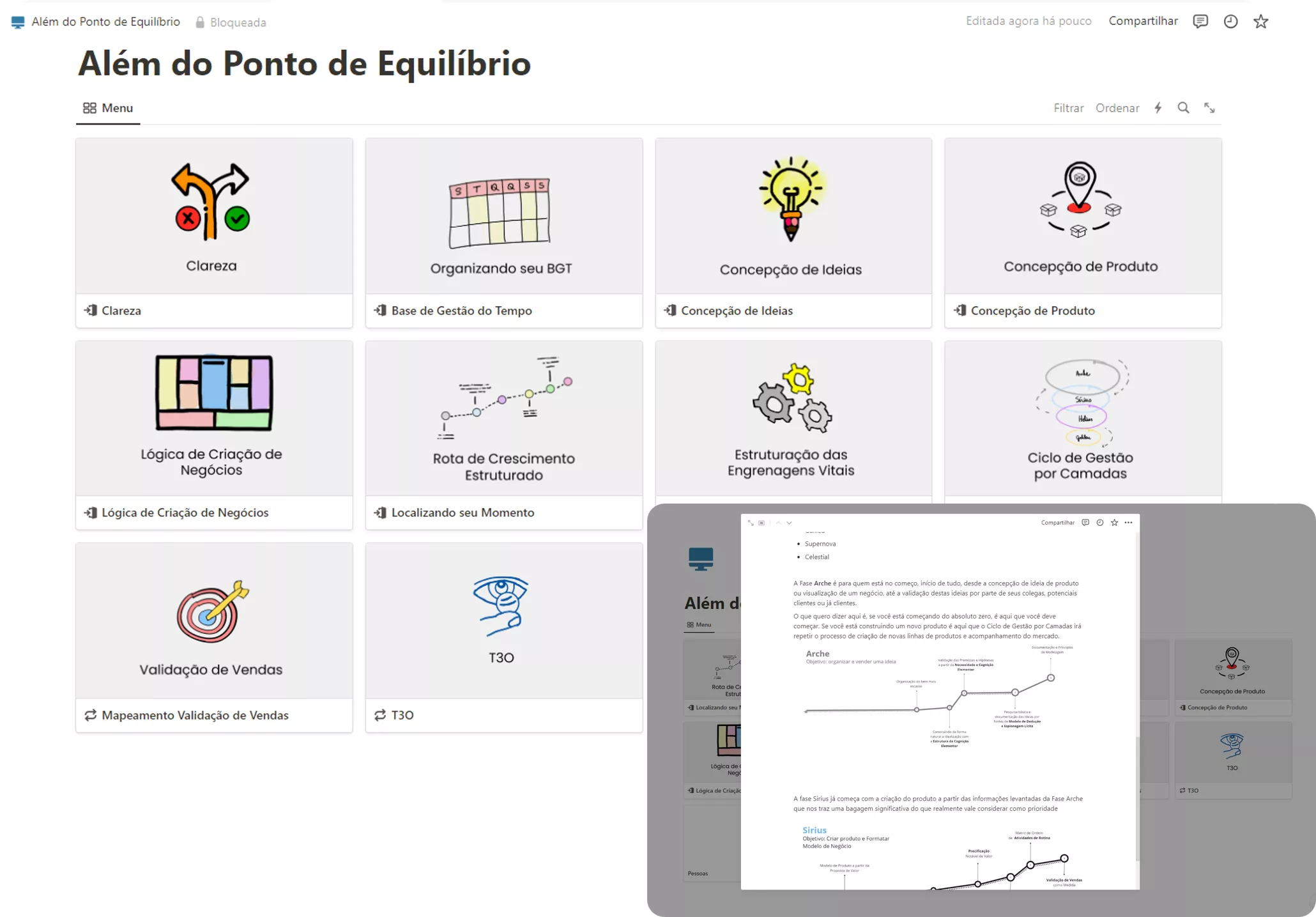 Você vai implementar toda a sua ideia, modelo de negócio no dashboard dentro do Notion. Lá você vai ter acesso a ferramentas de viabilidade, validação, precificação, documentação de ideias e organização de suas ações.